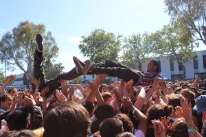 I had seen Together PANGEA a few times before, and I regard them as the little brothers of FIDLAR, because I saw playing them together a few times. Each time they install the same chaos with the kids surfing their hearts out. It’s punk with a sweet poppy-60’s vibe and screams-at-unison. They also had brought so many people on stage at the end of the set that it was adding to the confusion. Inside, Cosmonauts were riding a much darker surf wave, turning the inside of the Observatory into a reverb-fuzz echo-chamber. Back outside, Beached was producing surf-punk-girl-harmonies like a missing link between Best Coast and a Grrrl Riot band. The bands were in such a close succession that I couldn’t even rest for a minute. Frontgirl Jennifer Clavin liberated herself from her guitar to give bolder and somewhat different numbers and I was just wondering first of all, how uncomfortable her green latex mini skirt could have been (it was a hot day) and secondly, what Goldenvoice’s Gary Tovar thought, as he was watching them backstage.