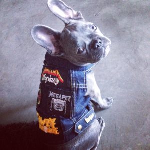 She gets her tees through companies like American Apparel, and her denim from a local company called Lazy J Jeans, then adds patches and other accessories, and here you get the doomest and scariest dog outfits you have ever seen. All the models figured on the blog look like French bulldogs or Chihuahuas but they sure make the same vests and tees for larger dogs. However, I click on one of their items in the store, the not-so-cheap 60 bucks heavy metal dog vest, and wow, it’s already sold out! How didn’t I think about it?