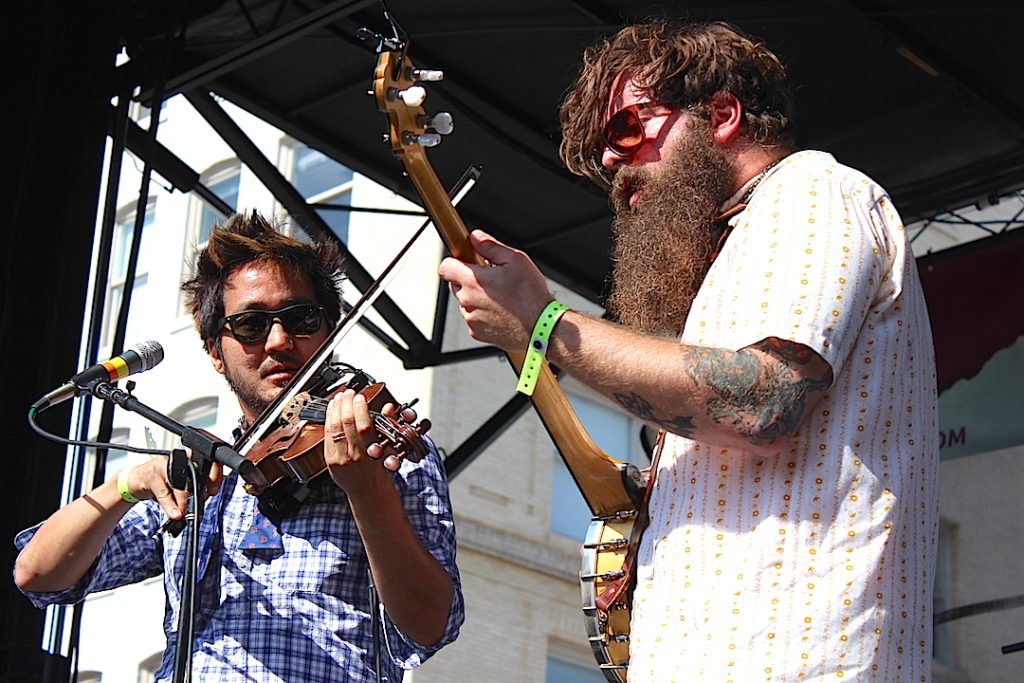 With a name like this, I was expecting something very ethnic, but Kishi Bashi revealed themselves to be more eclectic than exotic. They were a bit of everything, an Asian guy playing an electrifying violin, a heavy tattooed-bearded guy playing a mad electric banjo decorated with Inuit paintings, and you have to add to this an animated bassist plus a drummer, and the band was totally rocking and stomping, producing a furious new folklore.