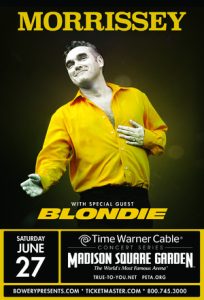 So anyway, Moz is a headcase and guess what Atlanta, he has a concert planned for you later this year and if he cancels it, it will be the FOURTH CONSECUTIVE TIME you will have been left at the altar. Me? I’m at one only, he cancelled the Barclay Center gig last year (actually two, he blew off a MSG gig a coupla years ago)  but I went the bucks for Moz at MSG on June 27th. With Blondie opening, though they kinda sucked when I saw em with X at Roseland two years ago.