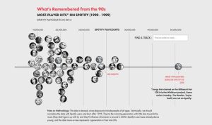 Of course there’s Spotify these days, and Daniels used this precious tool to produce the graph above and a few others, examining the popularity of the songs released from 1990 to 1999. Should we be surprised? Nirvana’s ‘Smell Like Teen Spirit’ is by far the most popular song of the 90’s getting more than 50 million play counts! Let’s hope Courtney Love doesn’t get any of this money.