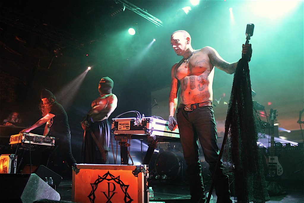 He was also entertaining the crowd with some deadpan macabre humor between the songs: ‘It’s fight or fuck, and judging by the size of the crowd, we may be doing both tonight!’ ….’ We are all gonna die, but some of you are gonna get killed!’ Much more effective and direct than any West’s 20-minute rants, if you want my opinion. His torso was covered by tattoos, graffiti style, his head was shaved, he kind of looked like a Mexican Tupac, holding a knife, hurting and screaming in repeat, ‘do you know who I am’ ….. Of course, Prayers’ act is a live act, it takes its dimension when you see them on stage, I am not sure the sole audio version is as effective as their theatrical representation, but there also were some very danceable electronic beats, swirls of distorted synth that people clearly noticed. For myself, I was too concentrated on the intensity and the existentialist dimension of the performance.