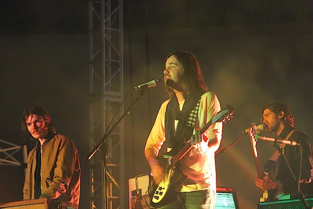 Can you be the frontman of a real rock band without half of David Bowie’s magnetism, Springsteen or Bono’s charisma, or without doing Iggy Pop’s repetitive crowd surfing and stage antics? I am bringing up very high profile characters here, but when there are ambitious settings and big outdoor concerts, this idea necessarily comes to mind, and without any of these big features, can a young band’s performance rise to everyone’s expectation? When I saw Tame Impala at Hollywood Forever Cemetery on Friday night, the crowd was dense, the stage and the lights as impressive as they could be, and the band’s performance intense and thrilling… still, Kevin Parker looked like the most reluctant rockstar ever, a shy frontman, who at the top of his band’s triumphant set, could only say ‘Thank you guys!’ Still, he was visibly moved by the experience, telling the crowd it was ‘the best experience of his life’, an ‘amazing’ moment he would ‘remember forever’, as if playing in a cemetery with the view on the Hollywood sign was the consecration of his young career.