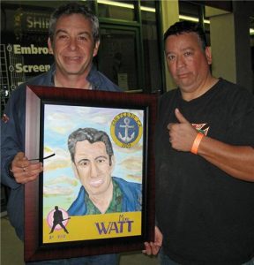 I used as a template one of my fave things, the Topps baseball card look. When I was The Little Huerta, I collected baseball cards the way Iman Lababedi collects chicks. I loved my cards. I would spend hours memorizing all of the stats etc..so of course, the artwork left a nice impression upon my person. I used Los Angeles Lakers colors because Watt is a huge homer for the local hoops squad. I dressed him in his customary flannel, he was wearing flannel before the Northwest peeps took that look over and claimed it as their own, and threw his outdoor jacket on him. Watt is an outdoorsman and rows all around Pedro when not touring. I also used the city of San Pedro city sign. Watt and The Minutemen basically put San Pedro on the map, at least musically. Peeps used to not even know where Pedro was, now everyone is from there, it seems. I also used Watt’s thunderstick stance as a silhouette and 1st bass as a play on base. I am sure you all caught that. The clouds represent the many moods and events of this multifaceted human. Mike Watt, bass player, writer, radio jock, trailblazer, good cat, a friend…respects to all.