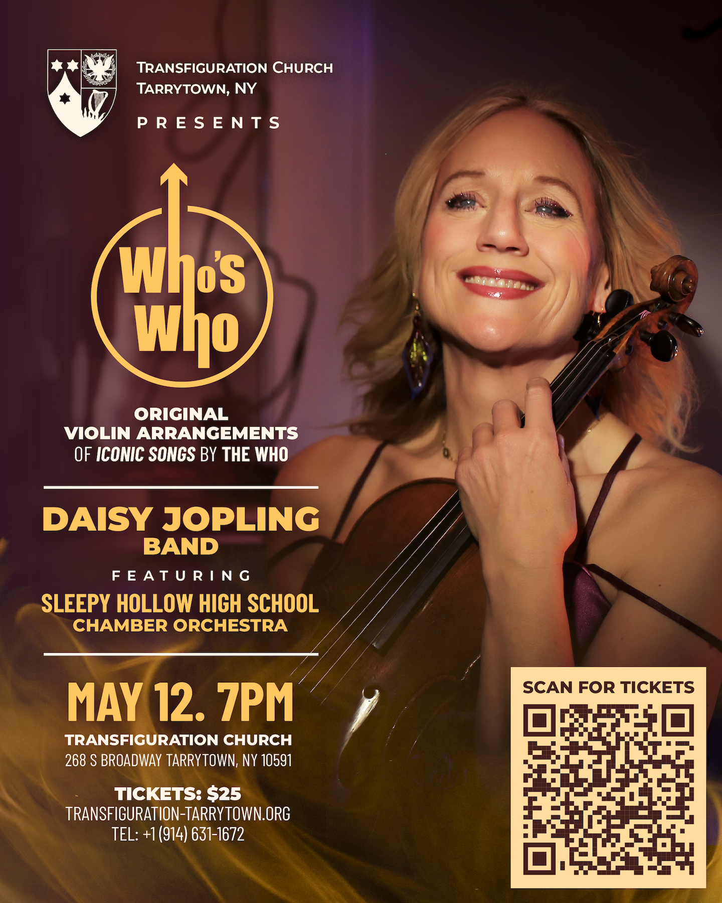 The Transfiguration Church in Tarrytown, New York Presents “Who’s Who”, original violin arrangements of iconic songs by The Who performed by the Daisy Jopling Band featuring the Sleepy Hollow High School Chamber Orchestra on Sunday, May 12th, 2024.