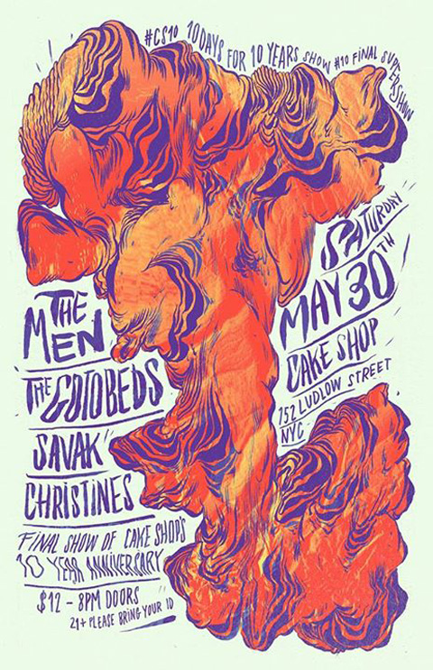 According to Brooklynvegan “Cake Shop’s monthlong 10th anniversary wraps up on Saturday (5/30) with their final “super show” featuring new Sub Pop signees The Gotobeds and SAVAK, the new band from Obits’ Sohrab Habibion and Greg Simpson. The show is now more “super” as The Men have been added as headliners, and Christines will open the show. Advance tickets are now available and that’s the flyer above.”